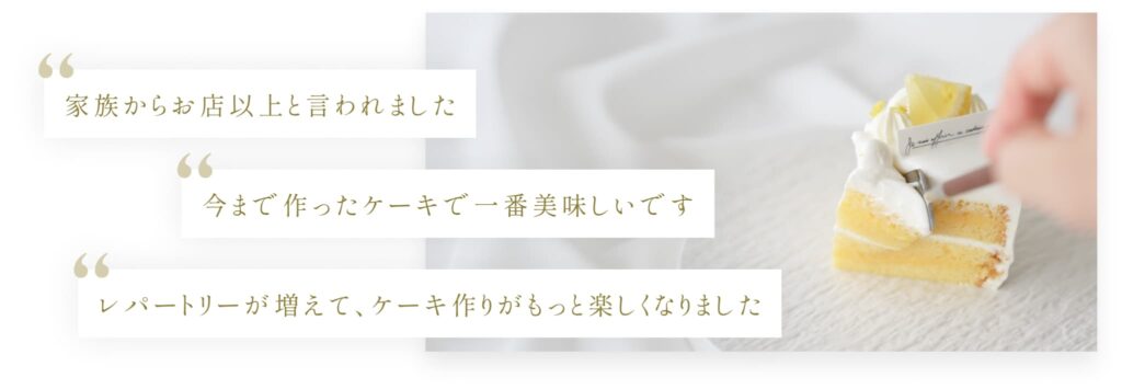 これにより初心者さんでも教材通りに練習することで美味しいショートケーキが作れるようになります。
