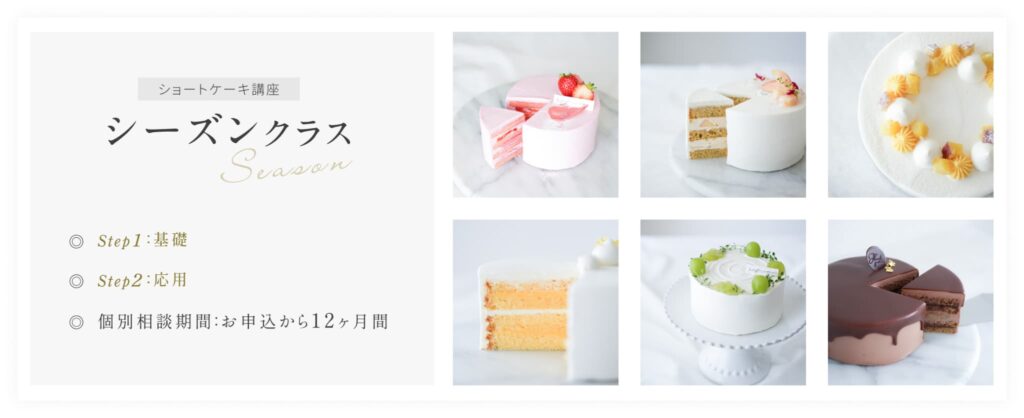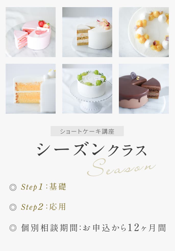 シーズンクラスでは、8種類の生地、17種類のクリーム、そしてガナッシュやソースなどの美味しいパーツが13種類も学べるので、季節を問わず、お気に入りのケーキを味わっていただけます。